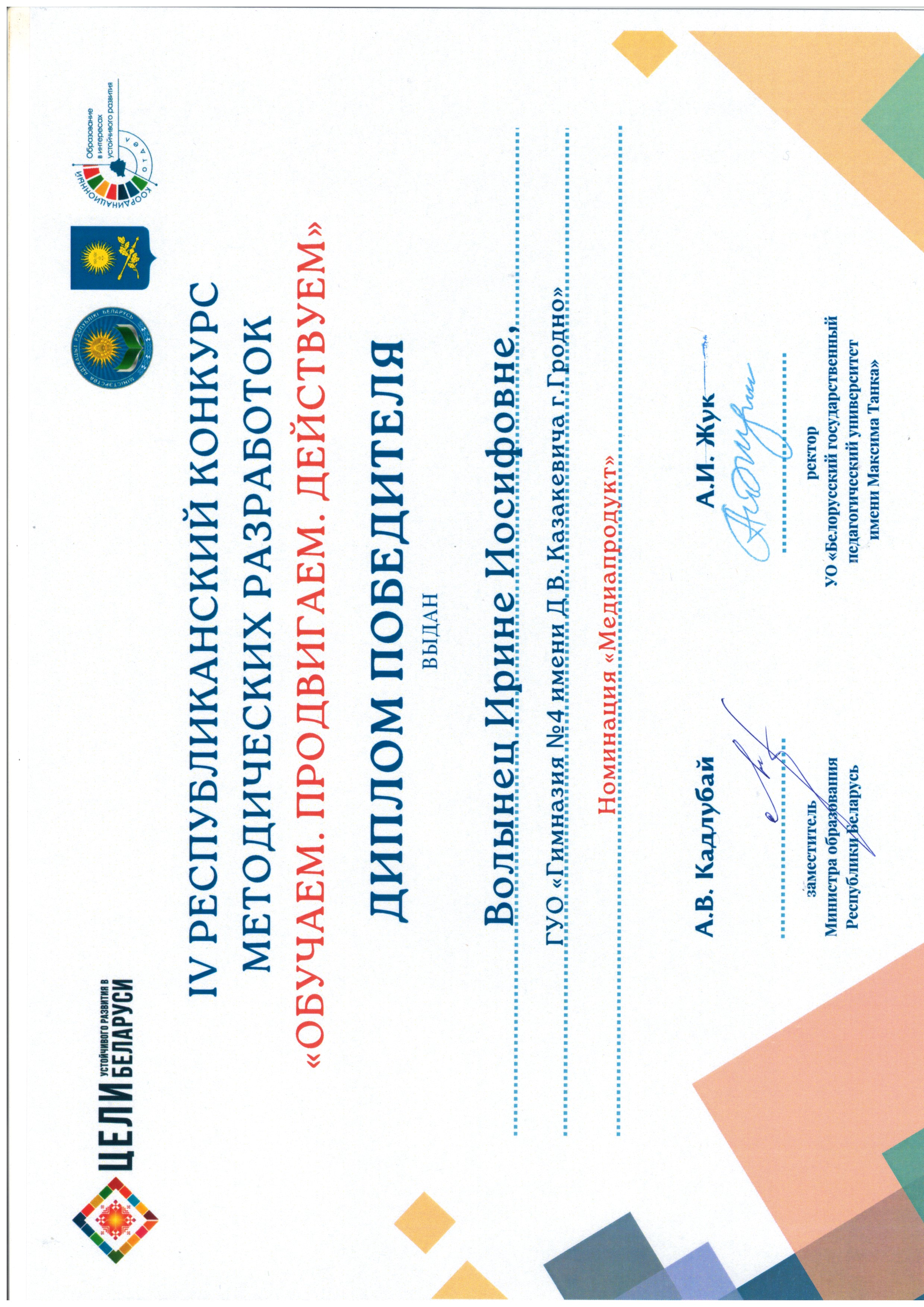 Авторский проект учителя английского языка ГУО «Гимназия № 4 имени Д. В. Казакевича» г. Гродно Волынец Ирины Иосифовны — виртуальная квест-игра «Сказки и чудеса заколдованного леса», разработанный в рамках международного марафона "Купаловские проекты",— получил высокую оценку жюри и был отмечен дипломом победителя в номинации «Медиапродукт».